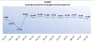 No acumulado de 2023, a Construção foi o segundo setor que mais gerou empregos formais: 253,8 mil vagas com carteira assinada foram abertas, o equivalente a 14,2% do saldo de empregos do Brasil neste ano.